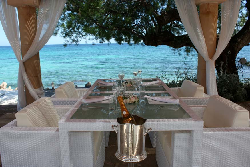 Cava- und Champagner-Empfang mit mallorquinischem Fingerfood über den Klippen, gefolgt von der Trauungszeremonie im wunderschönen runden Pavillon über dem Meer, Candle-Light Dinner für die gesamte Gesellschaft mit anschließendem ausgelassenen Tanz bis tief hinein in die sternenklare Nacht…